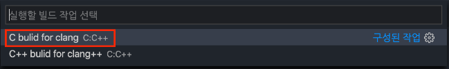 커맨드(⌘) + 쉬프트(⇧) + B 를 눌러주면 우리가 만들었던 빌드가 나옵니다. 저희는 C파일이기 때문에 "C build for clang"으로 빌드합시다.