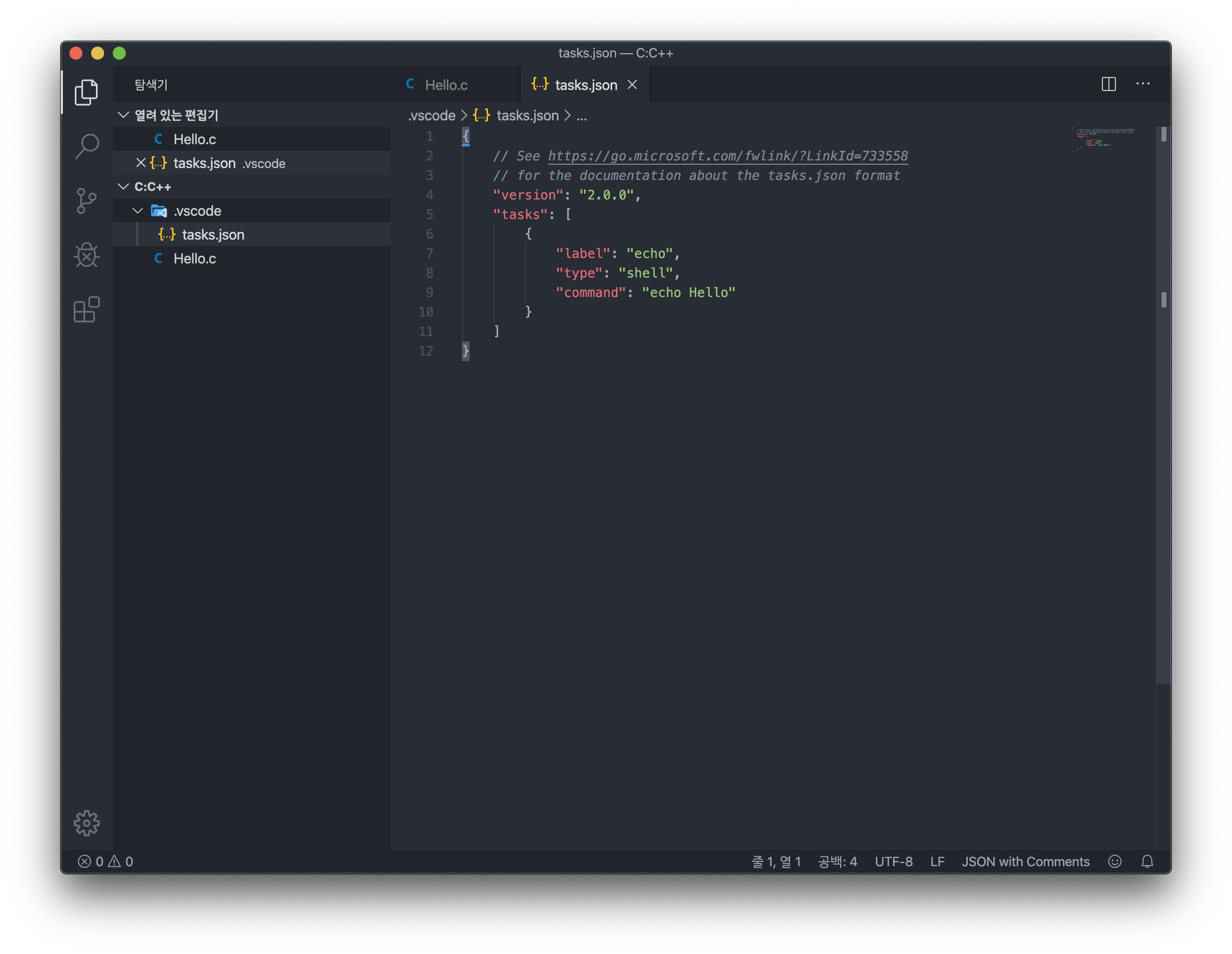 그러면 이렇게 짠! 하고 tasks.json이 생성됩니다.