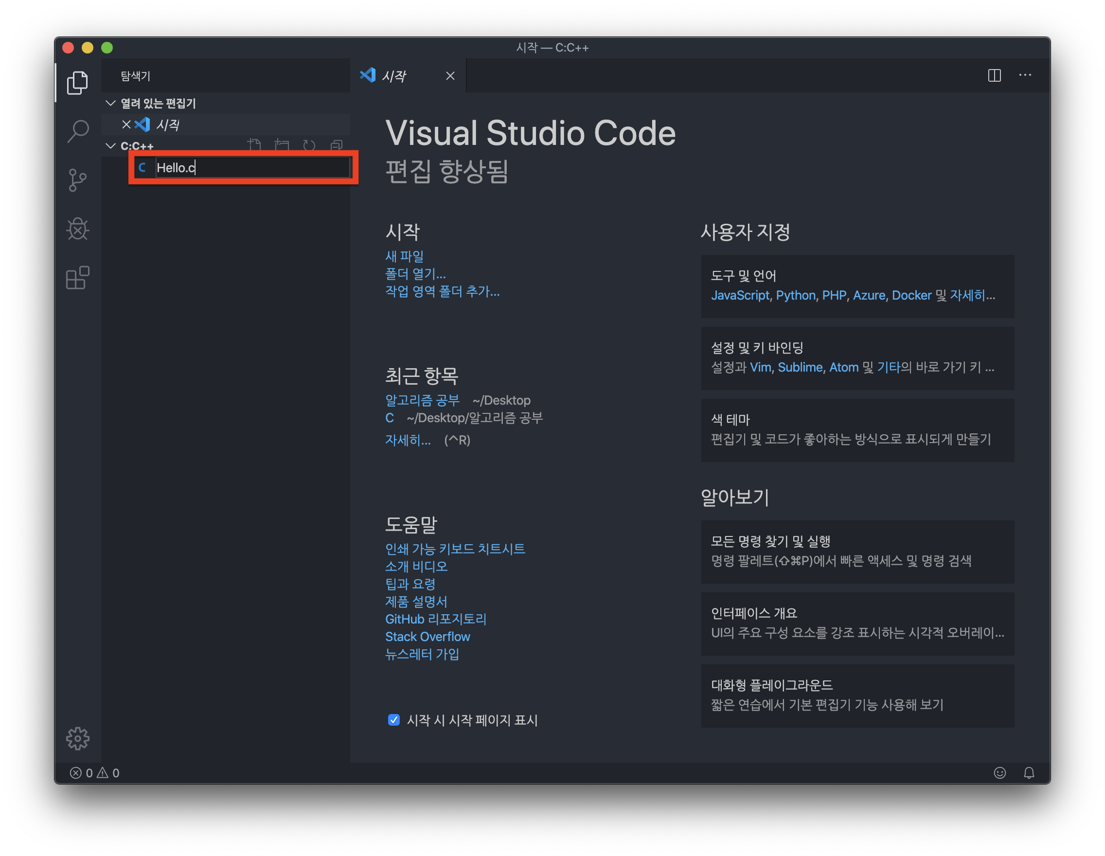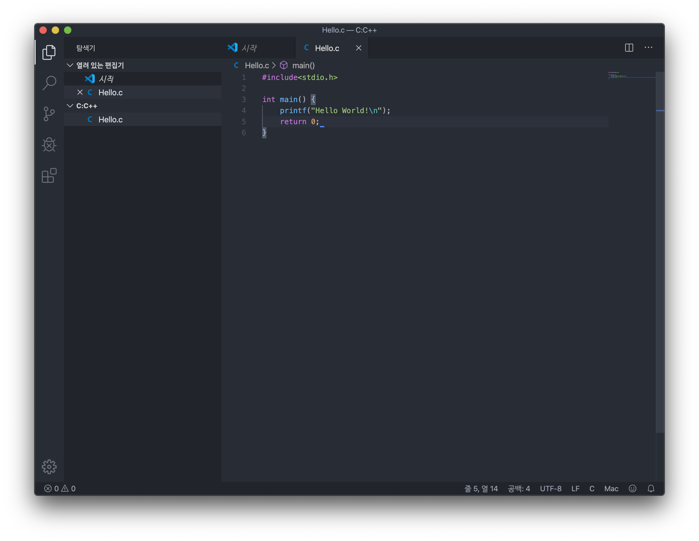 우선 컴파일을 설정하기 전에 컴파일할 간단한 C파일을 만들어 봅시다.