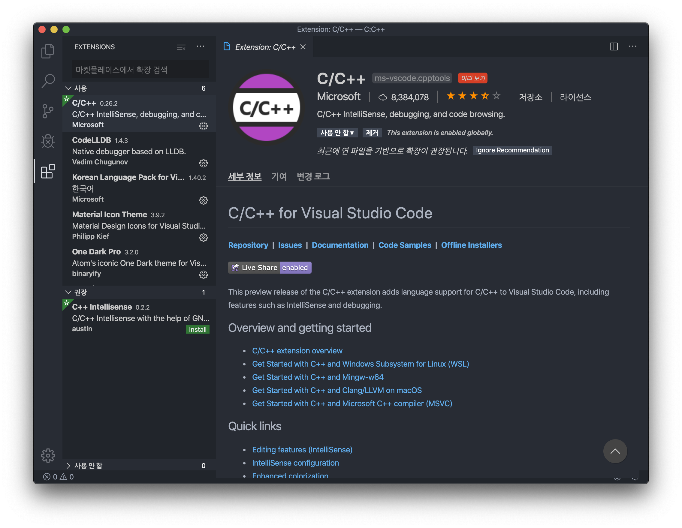 저는 이미 설치가 되어있지만, 여러분들은 C/C++을 검색해서 깔아주셔야합니다.