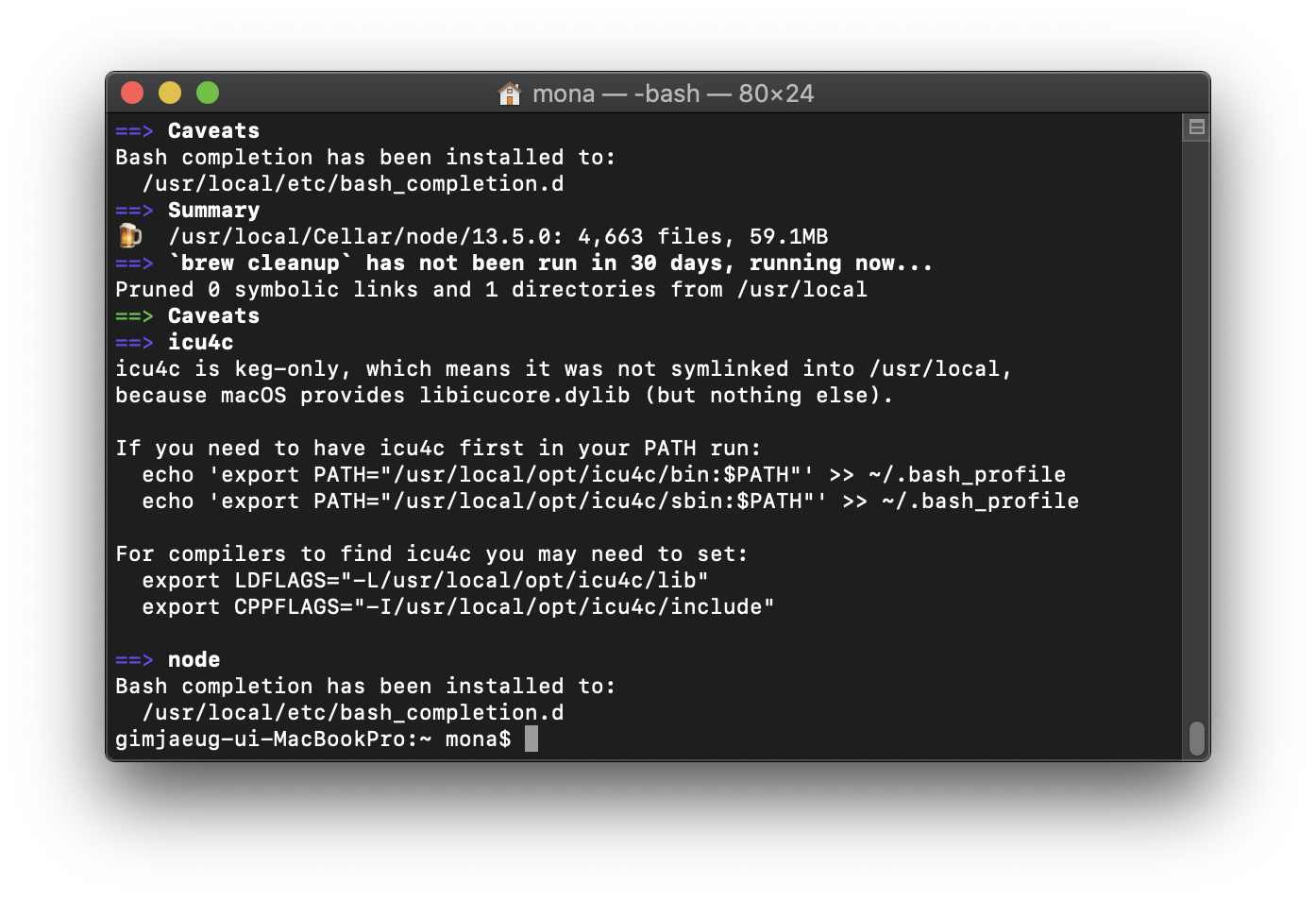 오늘은 간단하게 Homebrew를 이용해 Node.js설치를 해보았습니다. Node.js처럼 GUI가 필요하지 않는 프로그램이라면 Homebrew설치가 더욱 간편할 수 있습니다. 다음시간에는 간단한 예제서버를 만들어 보겠습니다.